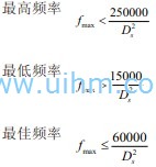 圆柱形零件表面淬火时,硬化层Ds与频率f之间的关系可用下面的公式计算: