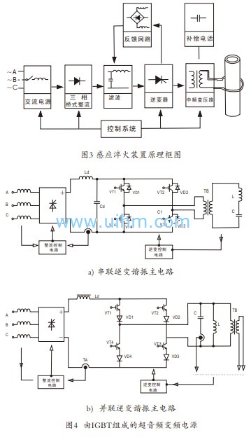 (2)IGBT的英文全称是Insulated Gate Bipolar Transistor,即绝缘栅双极型晶体管。传统的双极型功率晶体管具有耐压高、导通压降低等特点,但是开关速度比较慢,不适合高频应用场合;而功率MOSFET虽然有很快的开关速度,但是其耐压和电流容量较小。IGBT综合了双极型功率晶体管高耐压、导通压降低的特点和功率MOSFET的开关速度快特点,是一种适合于中、大功率应用的电力电子器件,目前已成为应用最广 泛的电力电子器件之一,IGBT在感应加热变频电源的应用,越来越普遍。主要占据着10KHz~60kHZ,几百到一千多kW的电源装机。图4是感应加热电源的两种主要线路。
