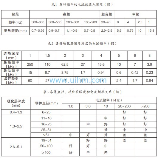 电流的频率决定加热透入深度,工件的加热方式、淬火质量和感应器设计。不同频率的电流在钢中的透入深度是不同的,频率越高电流透入深度越浅,频率越低透入深度越深。具体参考表1.