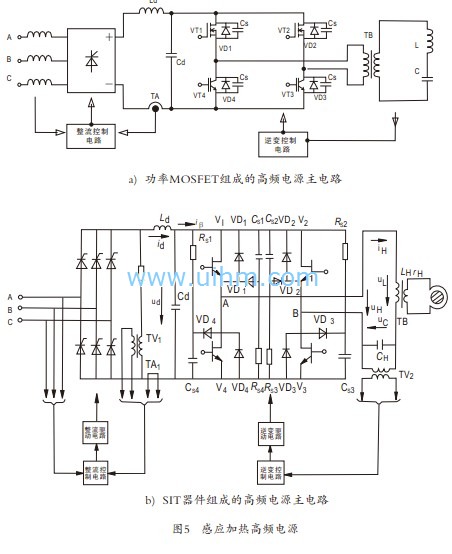 (4)静电感应晶体管(SIT)组成逆变电路的高频电源见图5的b)。静电感应晶体管(SIT)及静电感应晶闸管(SITH)是两种结构与原理有许多相似之处的高频大功率电力电子器件,是利用静电感应原理控制工作电流的功率开关器件。SIT和SITH具有功耗低、开关速度高、输入阻抗高、可用栅压控制开关的优点,在感应加热的高频段作大功率逆变电源装置,有很大的优势。