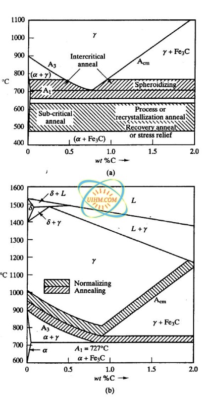 图:(a)温度范围为亚临界退火缓解压力和再结晶退火,退火(球化)。 (b)温度范围正常化和完全退火钢。