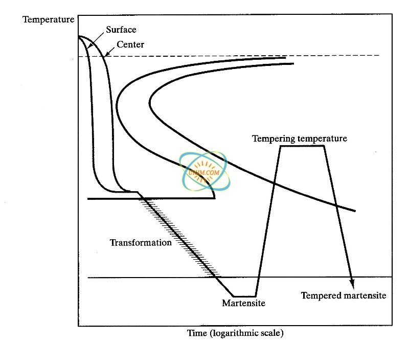 * 钢被加热到高于 A 1,迅速 的速率淬火速度不够快错过的鼻子(或膝关节)的TTT图以形成马氏体,并重新加热的温度下 ,A 1 以下,以达到所需的回火硬度。 合金元素减缓回火。