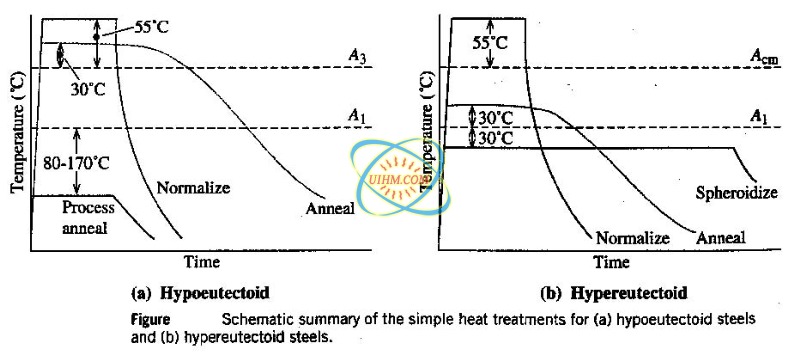 图:加热和冷却循环,缓解压力,处理退火,正火,完全退火的低和过共析钢。