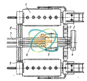 b) 在炉 1 锻件加热到淬火温度和炉 9 回火温度 (职位 7、 8、 1、 2、 3、 5、 9) ;