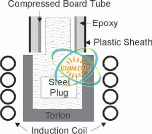 also available by using the “READ” command. The satellite Star 3 responds with a data stream consisting of DC voltage, DC current, DC power, operating frequency, heat-on time, power supply status, and internal fault diagnostics. Since the data request, gathering and transmission take approximately 100ms, the full heat cycle characterization is achievable. This application involves heating a small steel plug, which in turn provides the thermal energy for curing the epoxy on the part. As shown in Figure 5, the plug is 1.125” in diameter and rests in a Torlon plastic mold. For a complete cure, the temperature at the epoxy surface must be maintained at 400°F for six minutes. Figure 6 illustrates the tooling at the production site: a rotary table with space for 30