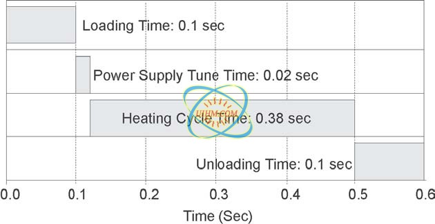 Figure 3: The satellite Star 3H was programmed for a short 0.6 second heat cycle, and required only 0.02 seconds for digital tuning. Most existing annealing systems utilize multi-turn pancake style coils and are powered by large, relatively inefficient vacuum tube power supplies. The output is often inconsistent and constant adjustments are needed to maintain product quality. The satellite Star series power supplies automatically tune their frequency of operation to the load during every cycle, providing optimized precision heat to every part. Digital frequency synthesis and microprocessor control deliver repeatable results, part after part, cycle after cycle. As a result, a 3kW satellite Star solid state power supply can often replace a much more powerful older machine, thus reducing cost.