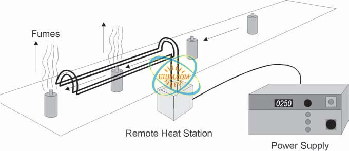 Figure 8: Both the low-voltage power supply and remote heat station can be located out of the path of the corrosive flux fumes produced by this soldering application. Small Remote Heat Station