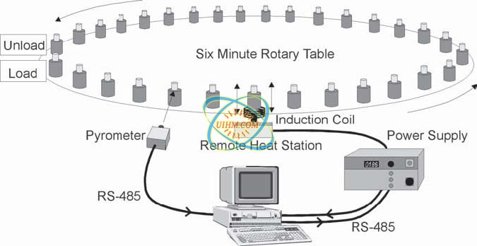 steel plugs placed equidistant along the circumference. The process allows for 4 seconds of heating time per 6-minute cure cycle. The parts are loaded on the steel plugs at one station and heated to a surface temperature of 450°F in 4 seconds. The satellite Star 3L delivers 3kW of power at 186kHz for this application. As the table rotates each plug away from the induction coil, they gradually transfer their heat to the epoxy assemblies and torlon plastic. At the end of the cycle, the parts are unloaded off of the steel plugs, and then a new heat cycle begins with fresh parts. Each steel plug retains some of its heat from one heat cycle to the next. An optical pyrometer measures the temperature of each plug just before it enters the induction heating coil. Using the RS-485 interface, a determination is made as to how much energy needs to be delivered to the plug to bring its temperature back to 450°F. The satellite Star 3L is instructed through the RS- 485 interface to deliver the right amount of heat for the predetermined time to each steel plug. Conclusion The satellite Star 3L’s RS-485 interface