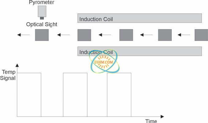 temperature of the punches. The pyrometer is set on peak picker mode so that it can correctly read temperature even if the work piece is moving and is only in the field of view for a short time. It is also capable of viewing parts with variable spacing , which occurs if there is an empty location due to a misfeed. The UIHM satellite Star 3L solid state induction heating power supply accepts multiple control signals from an infrared pyrometer and other external sources with 0-20mA, 4-20mA, 0-10V or 0- 5V input control signals with excellent resolution. This results in a closed loop temperature control system which transfers power with accuracy and precision to the punches passing through the coil. Figure 10 shows how the pyrometer works in peak picker mode. The pyrometer’s circuitry responds to the highest instantaneous value of the temperature and holds this value even if the temperature source is interrupted by one of the conditions listed above. The indicated temperature can be set not to decay during the index cycle of the punches (when there is no temperature